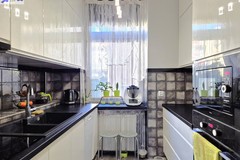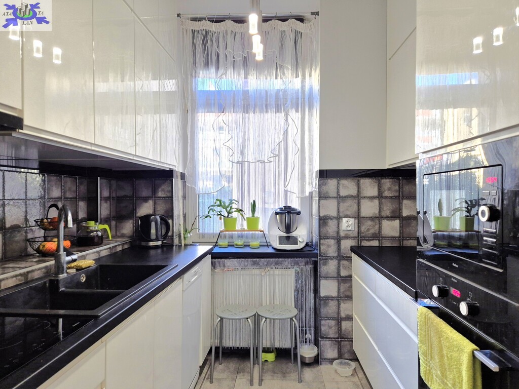 * widna kuchnia z nowymi meblami w zabudowie, wyposażona w płytę indukcyjną, mikrofalówkę, piekarnik, zmywarkę oraz lodówkę z zamrażarką