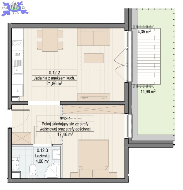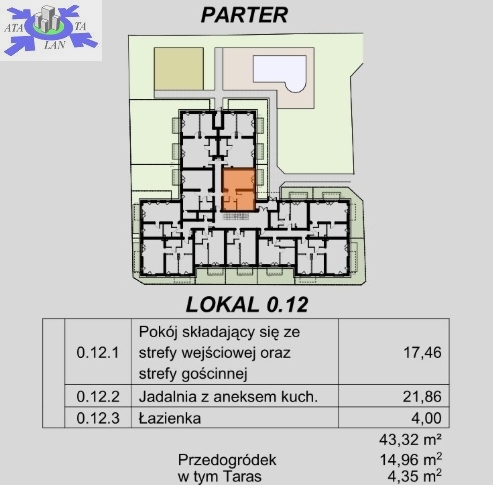 Apartament będący przedmiotem tej oferty znajduje się na parterze i ma powierzchnię 43,32 m2. Składa się z salonu z aneksem kuchennym, sypialni, garderoby, łazienki i przedpokoju.