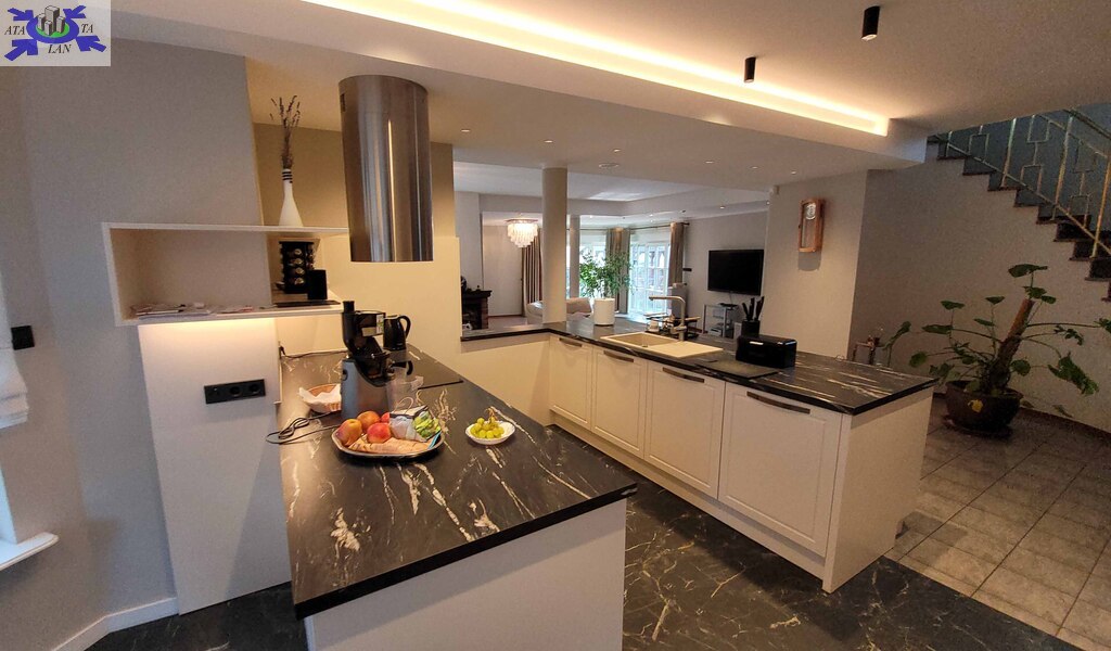 -Przestronna, otwarta strefa dzienna salon z kominkiem, kuchnia z jadalnią (82,93 m2) i wyjściem na ogród,