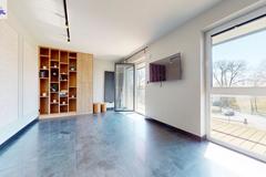 -elegancki salon z aneksem kuchennym i miejscem na stół jadalniany (z pokoju jest pierwsze wyjście na taras)