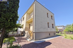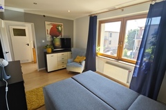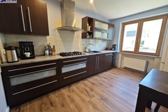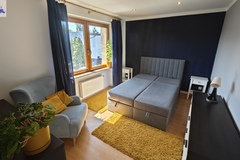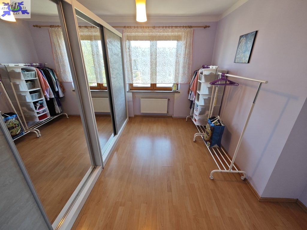 Na parterze znajduje się bardzo duży salon o powierzchni ponad 32m2 z wyjściem na taras (możliwość wykonania zejścia na ogród), osobno kuchnia 11m2 z oknem, łazienka 4m2 również z oknem, hol oraz wiatrołap. Istnieje możliwość podzielenia salonu na dwa niezależne pokoje uzyskując w ten sposób piąty pokój (np. pomniejszając salon z 32m2 do 22m2 uzyskujemy dodatkowy gabinet o powierzchni 10m2). Na górny poziom prowadzą wygodne schody (wylewka betonowa plus stopnie wykończone drewnem). Piętro to trzy niezależne pokoje (największy ponad 19m2 z wyjściem na balkon plus dwa pokoje po 12m2), kolejna łazienka prawie 6m2 z oknem oraz hol 5m2 z wyjściem na kolejny balkon. Poziom piwnicy to przede wszystkim duży garaż z nową, automatyczną bramą (łagodny zjazd do garażu), pomieszczenie z piecem gazowym II-obiegowym firmy Junkers, pomieszczenie gospodarcze oraz pomieszczenie od strony ogrodu z bezpośrednim wyjściem na ogród, gdzie właściciele przechowują narzędzia do konserwacji ogrodu (między innymi kosiarkę do trawy).
