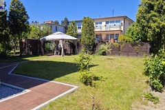 Niewątpliwym atutem nieruchomości jest ładnie zagospodarowany ogród (mniejsza część znajduje się od strony ulicy, zaś główny ogród znajduje się na tyłach nieruchomości). Ogród jest przede wszystkim pokryty ładnie utrzymanym trawnikiem z alejkami wyłożonymi polbrukiem plus nieliczne drzewka (wierzba oraz dwie wiśnie) i dodatkowo miejsce do wypoczynku pod rozstawianym namiotem. Ogródek jest bardzo słoneczny. Poza garażem w bryle budynku - na posesję można wjechać przez drugą bramę wjazdową, aby zaparkować dwa kolejne samochody (przed posesją kolejne dwa miejsca postojowe).