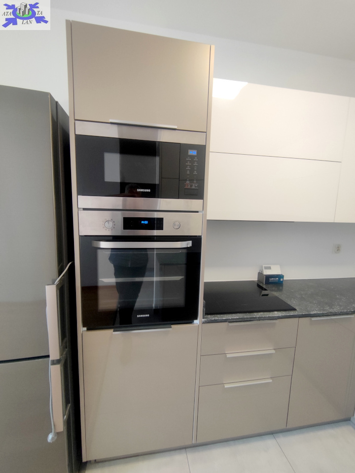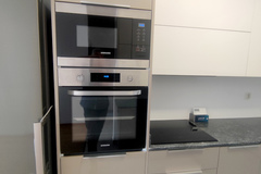 W kuchni meble w zabudowie wraz ze wysokiej jakości sprzętem AGD.