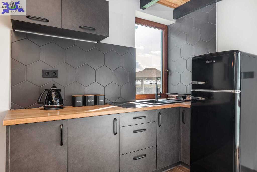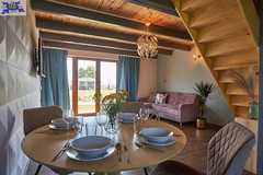 Parter otwarta przestrzeń dzienna z kuchnią, częścią jadalną i wypoczynkową oraz łazienka z kabiną prysznicową. Rozkładana sofa pozwala na zakwaterowanie dodatkowych osób