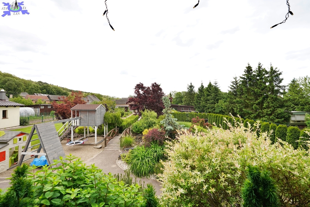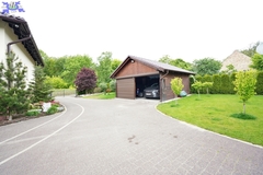 Zadbany gęsty trawnik z rolki, automatyczne nawadnianie, kamienna piwniczka, budynki gospodarcze i wolno stojące dwa duże garaże.