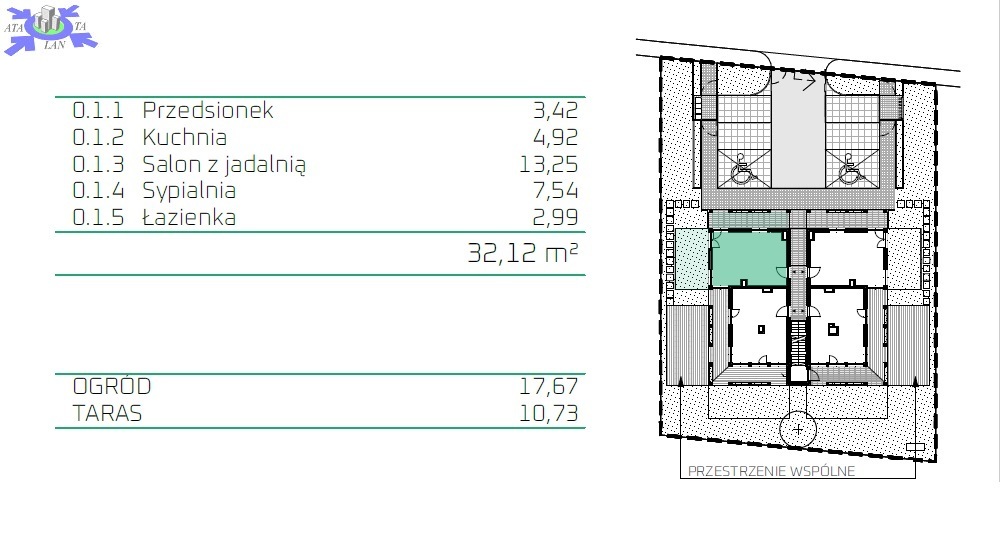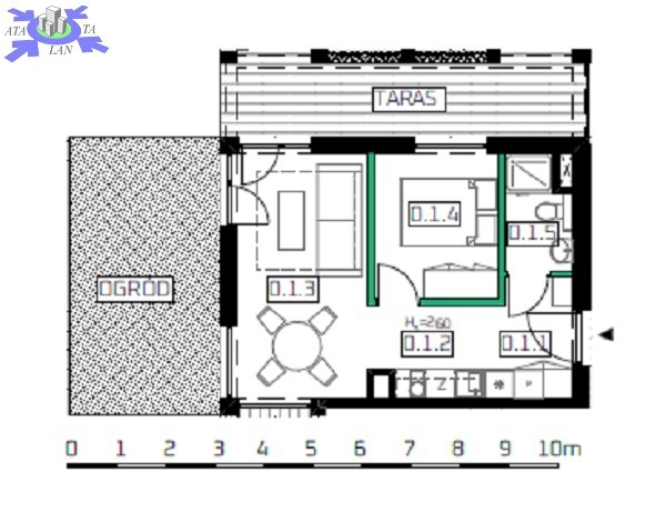 Prezentowany apartament ma powierzchnię 42,08 m2, ogród 17,67 m2, taras 10,73 m2