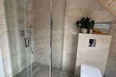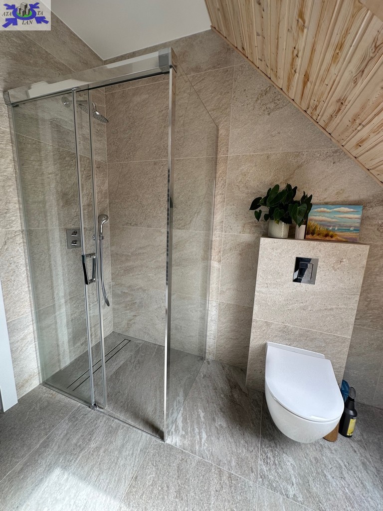 - łazienka z prysznicem, w której znajduje się piec dwuobiegowy Bosch w zabudowie