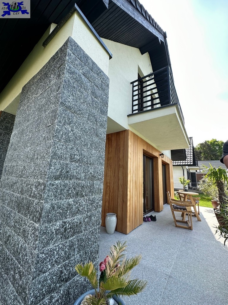 Budynek wykonany z pustaka ceramicznego z dachówką Roben, na elewacji drewno Okoume oraz kamień - granit.
