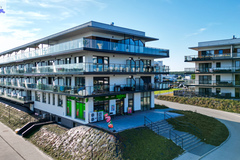 Ogromny taras 36,6 m2 z widokiem na eleganckie patio i rzekę Dziwną - idealny do relaksu i spotkań towarzyskich.