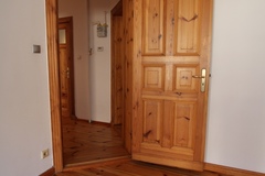 Stylowe wykończenie - oryginalne drewniane drzwi po renowacji, deski na podłogach, a w kuchni i garderobie nowoczesne panele.