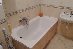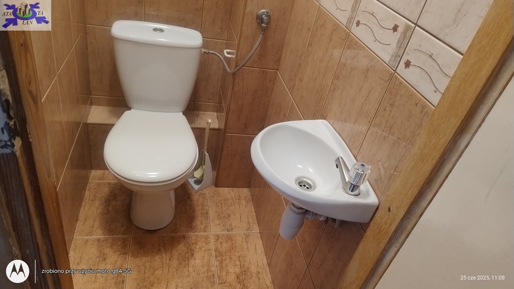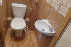 Osobna kuchnia - 8 m2, łazienka z wanną, umywalką i zainstalowanym piecem I biegowym na ciepłą wodę - 3,5 m2 , osobne wc - 1 m2. W tych pomieszczeniach na podłodze również terakota, w łazience i wc kafelki na ścianach.