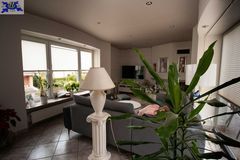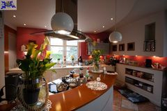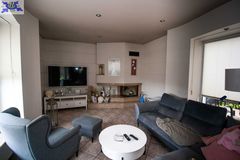 - PARTER - 119,9 m2. Na tym poziomie zlokalizowany jest pokój dzienny 45 m2 z kominkiem otwarty na widną kuchnię - 15,4 m2 z jadalnią - 8,5 m2. Z salonu jest wyjście na 10 metrowy taras i dalej na ogród. Na podłodze kafle, sufity podwieszane z punktowym oświetleniem. Poza tym na poziomie parteru mamy pokój pełniący funkcję garderoby - 10,5 m2, łazienkę z WC, holl - 23 m2. Kuchnia z zabudową meblową robioną na wymiar wraz wyposażeniem może pozostać w cenie nieruchomości.