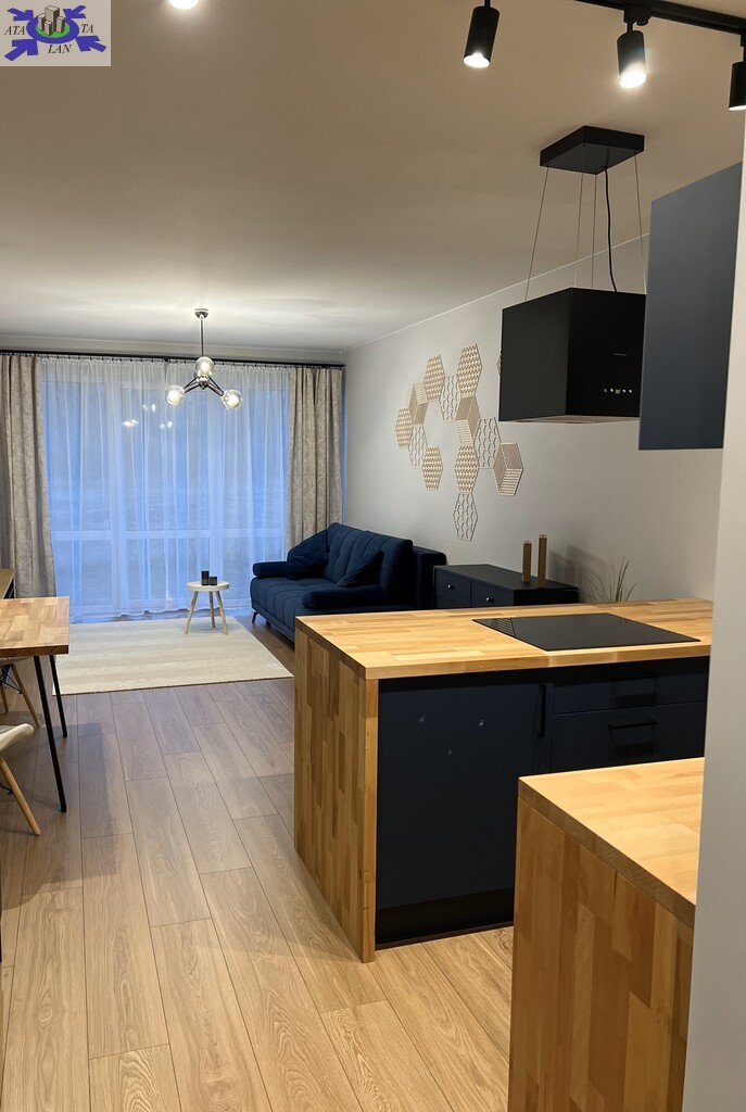 - Salon z aneksem kuchennym - nowoczesna zabudowa z drewnianymi blatami, sprzęt AGD i lodówka w cenie