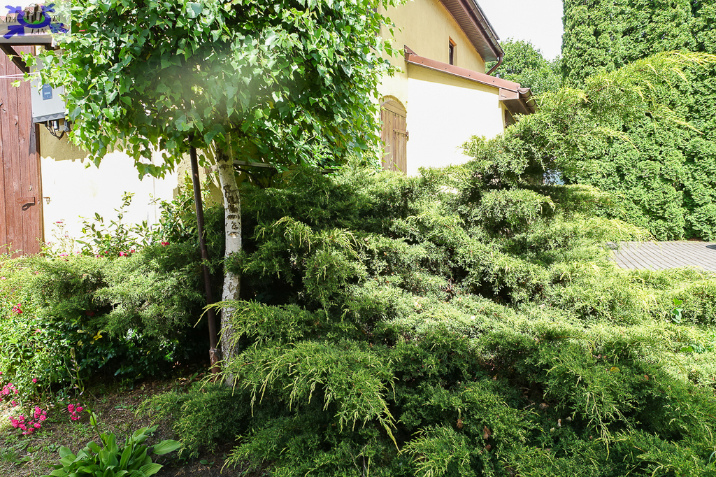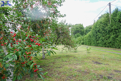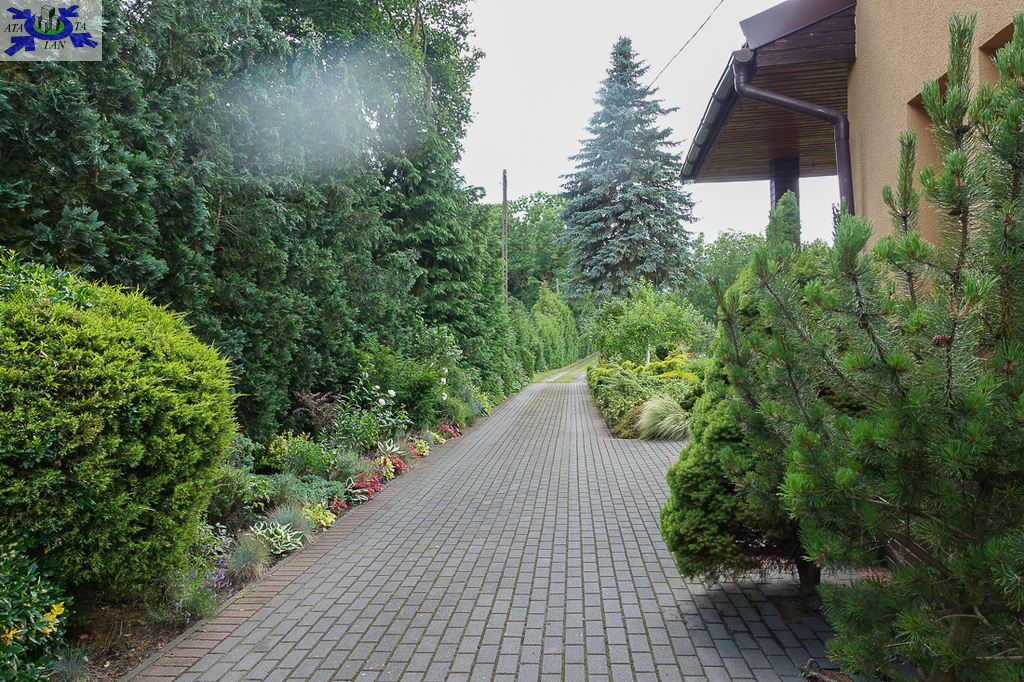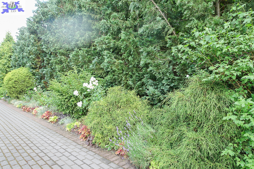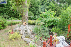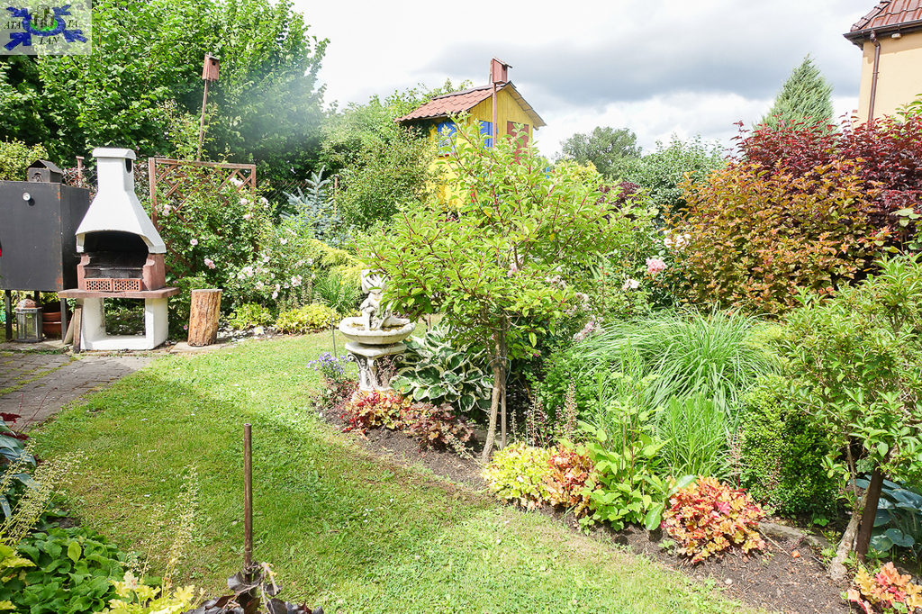 OPIS TERENU działka 3340 m2, możliwość postawienia drugiego domu, ponadto nowa altana drewniana z tarasem, domek dla dzieci, duża ilość pięknych krzewów i nasadzeń, kwiatów wieloletnich, sad owocowy z jabłoniami, wiśniami, czereśniami, warzywniak, mała fontanna, pomieszczenie gospodarcze, 2 garaże o wysokości 2 m, jeden o powierzchni 12,5 m2, drugi 9 m2 każdy o długości 5 m i wysokości w najniższym punkcie 2 m. Nad garażami zagospodarowany strych.