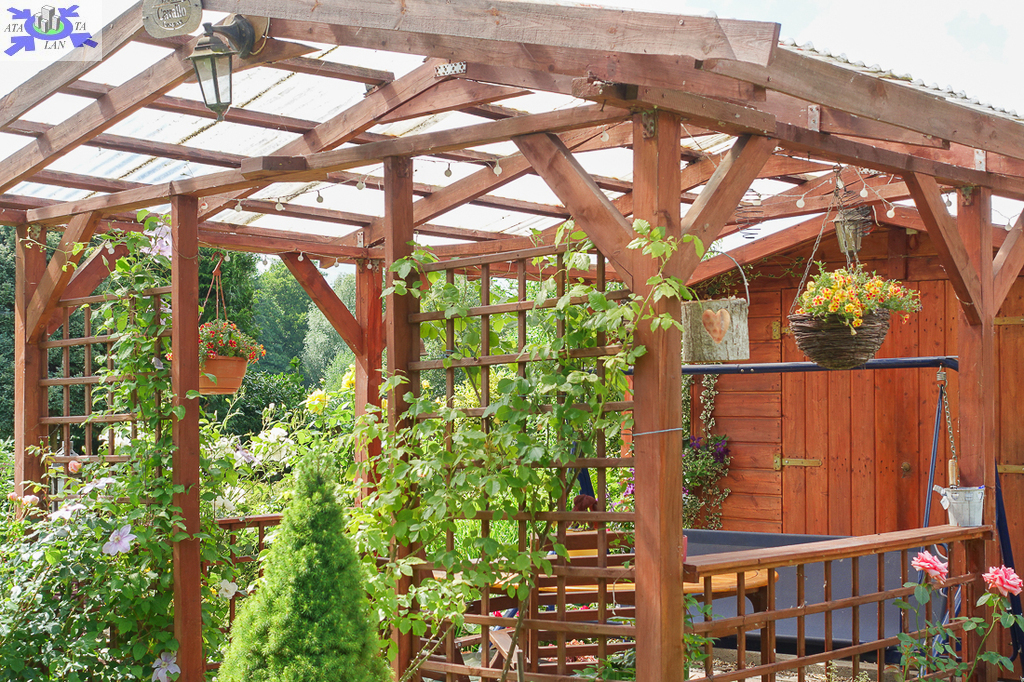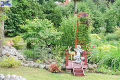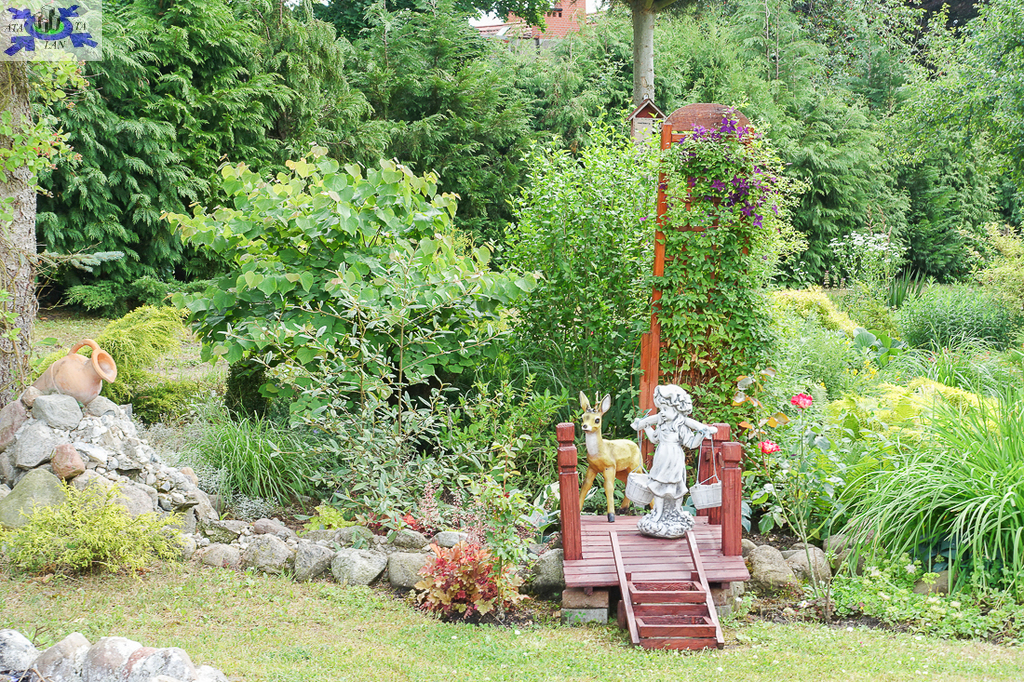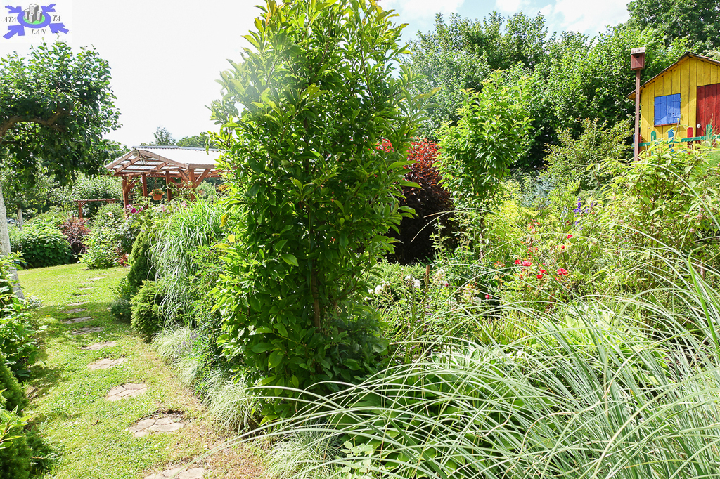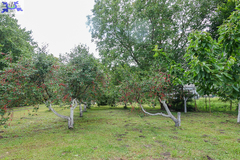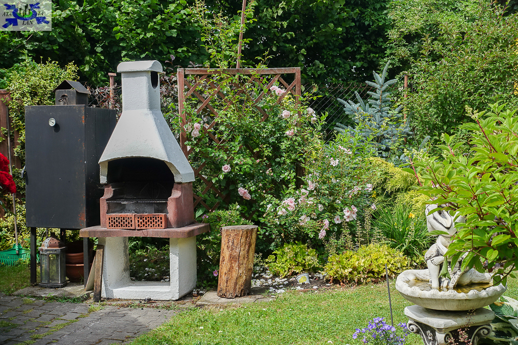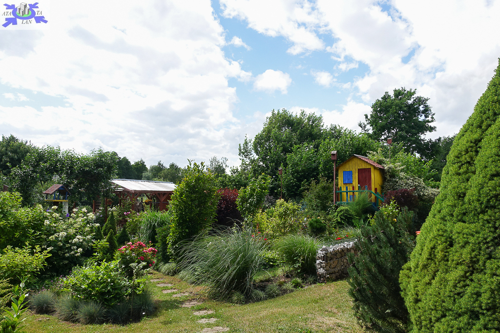 OPIS TERENU działka 3340 m2, możliwość postawienia drugiego domu, ponadto nowa altana drewniana z tarasem, domek dla dzieci, duża ilość pięknych krzewów i nasadzeń, kwiatów wieloletnich, sad owocowy z jabłoniami, wiśniami, czereśniami, warzywniak, mała fontanna, pomieszczenie gospodarcze, 2 garaże o wysokości 2 m, jeden o powierzchni 12,5 m2, drugi 9 m2 każdy o długości 5 m i wysokości w najniższym punkcie 2 m. Nad garażami zagospodarowany strych.