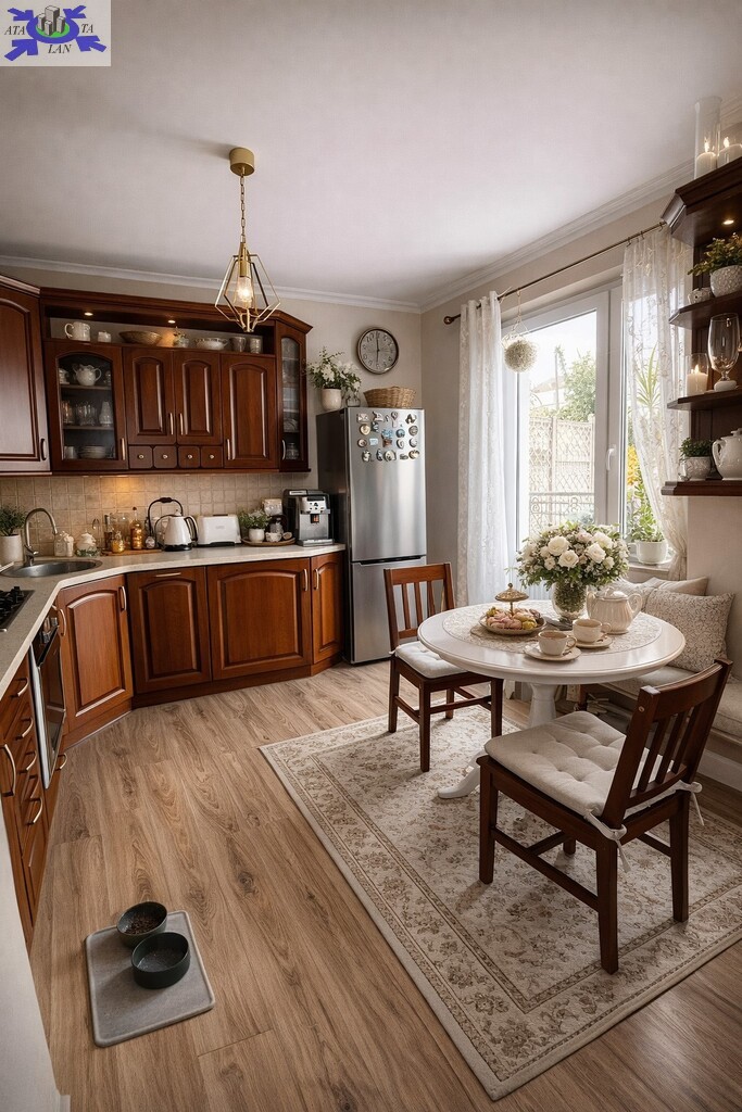 Na szczególną uwagę zasługuje przestronna, jasna kuchnia, z której prowadzi bezpośrednie wyjście do prywatnego ogródka. To miejsce idealne na poranną kawę, rodzinne śniadania w ciepłe dni czy wieczorny relaks w otoczeniu zieleni.