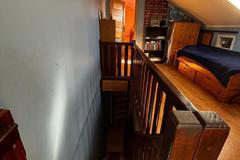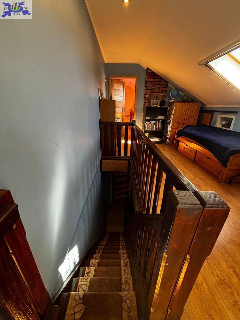 - pokój przejściowy ze schodami drewnianymi na podłodze panele podłogowe, na ścianach gładź malowana, okna PCV i połaciowe,