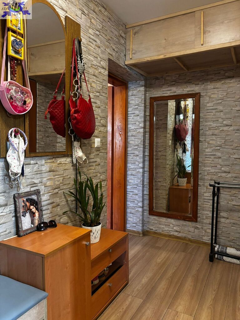 - korytarz na podłodze panele podłogowe, na ścianach tapeta, drzwi do