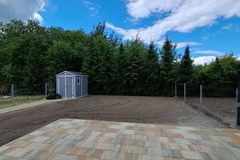 Ogródek o wielkości 350m2 z ładną, równą trawą oraz tarasem wyłożonym gresem. Do budynku przynależą dwa miejsca parkingowe, ale w praktyce istnieje możliwość postawienia większej ilości samochodów.