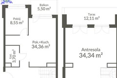 Salon z kuchnią 34,36 m2- z którego przedostać się można do pokoju, łazienki i na balkon