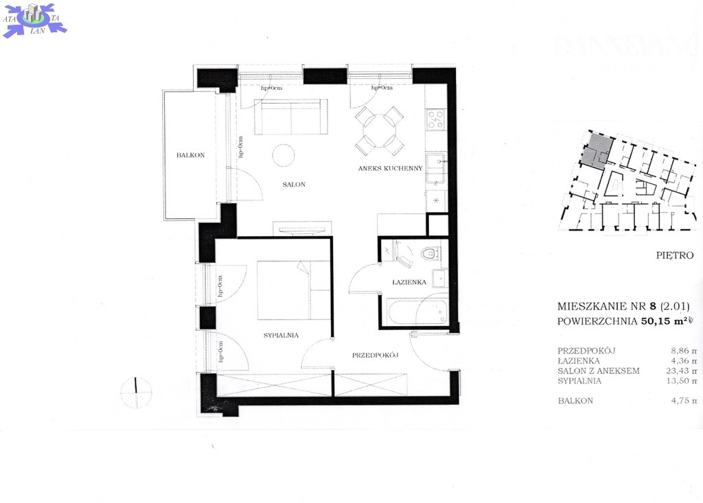 OPIS MIESZKANIA mieszkanie 2 pokojowe o powierzchni 50,15 m2, z wyjściem na balkon o powierzchni 9 m2. Pokój z aneksem kuchennym o powierzchni 23,03 m2, sypialnia 16,83 m2, łazienka 3,75 m2, przedpokój 5,42 m2. Balkon od strony południowej o powierzchni 4,75 m2. I piętro w V piętrowym budynku z windą. Wystawa okien południowa.
