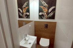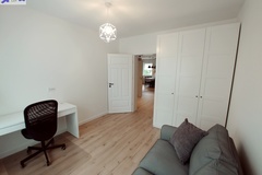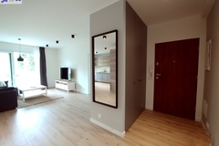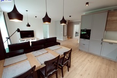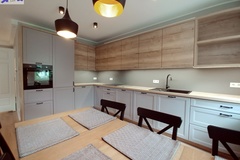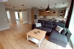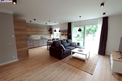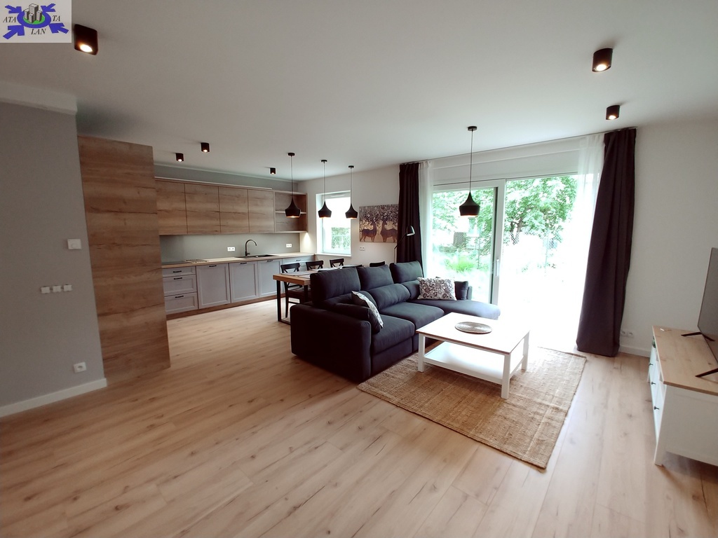 Komfortowe mieszkanie będzie w pełni umeblowane i wyposażone. Posiada salon z aneksem kuchennym ok. 44m2, trzy sypialnie 16, 13 i 12m2, przedpokój i łazienkę 6m2 z kabiną prysznicową, oraz dodatkowe osobne wc. Z salonu wyjście na taras 40m2 i ogródek 100m2. W przedpokoju miejsce z szafa 2 skrzydłową. Możliwość przejścia z garażu do ogrodu.