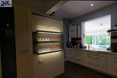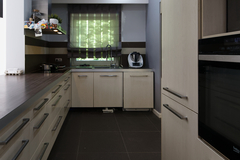 Kuchnia jest w pełni wyposażona w nowoczesny sprzęt AGD płytę indukcyjną, okap, piekarnik, zmywarkę, kuchenkę mikrofalową, ekspres do kawy oraz ozdobną ściankę z zabudowanym barem.