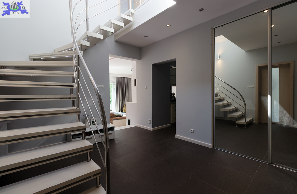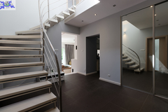 przedpokój z podświetlanymi schodami prowadzącymi na piętro oraz dużą szafą w zabudowie z lustrzanymi frontami, wykonaną na wymiar.