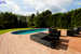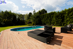 Szerokie, przesuwne okna tarasowe typu HST zapewniają doskonałe doświetlenie wnętrza oraz płynne połączenie salonu z zielonym otoczeniem, prowadzą bezpośrednio na duży taras z murowanym basenem (o wymiarach 9m długość x 4m szerokość i głębokość 1,5 m) oraz piękny kilkunastoletni ogród.