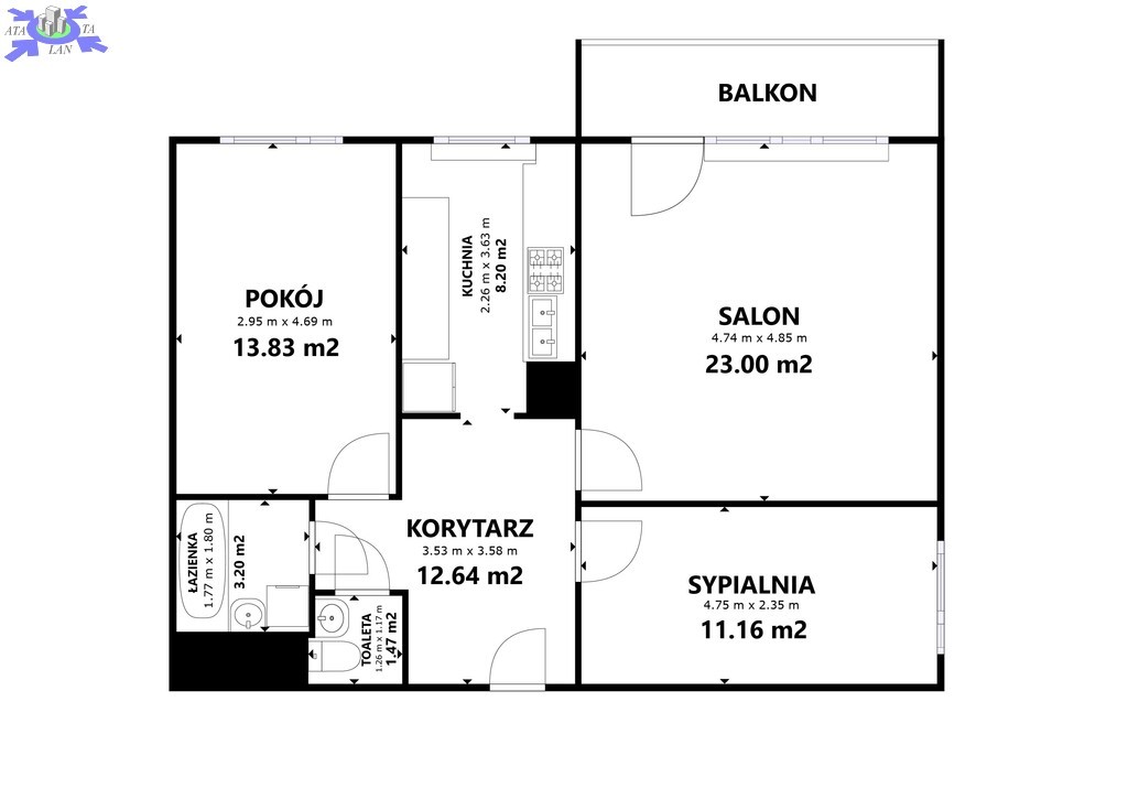 Przestronne trzypokojowe mieszkanie o powierzchni 67,77 m2 składa się z