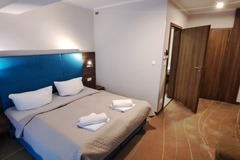 - pokój z podwójnym łóżkiem, szafą garderobianą oraz wygodnym miejscem do siedzenia z ekspresem do kawy,