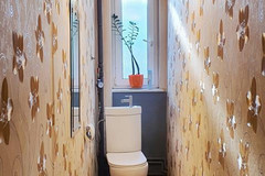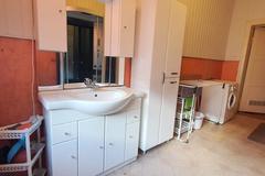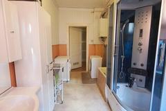 Duża łazienka z oknem, wanną, kabiną prysznicową i umywalką oraz oddzielna toaleta z umywalką.