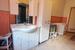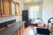 Oddzielna kuchnia z oknem, wyposażona w meble w zabudowie, lodówkę z zamrażarką i kuchenkę gazową, na podłodze panele, między szafkami fartuch z kafli.