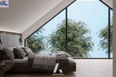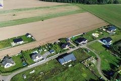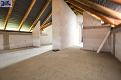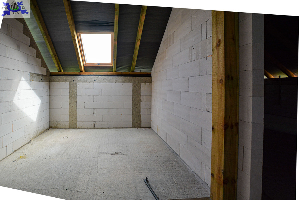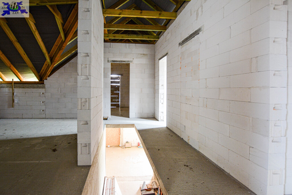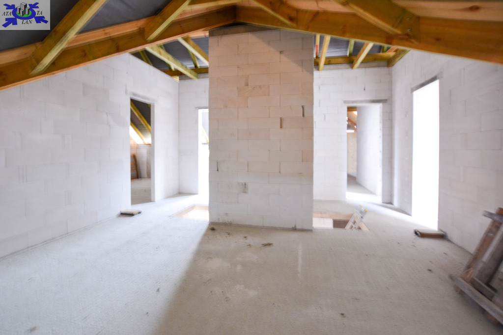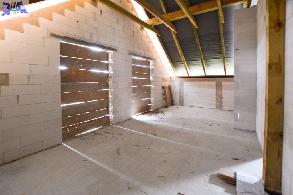 Budynek wolnostojący z użytkowym poddaszem, posadowiony na działce o powierzchni 1373m2 Nieruchomość w stanie surowym, bez okien. Dach kryty dachówką Creaton Koda.