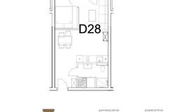 Lokal o powierzchni 37,03 m2, składa się z salonu z aneksem kuchennym, sypialni, łazienki wraz z WC oraz przedpokoju.