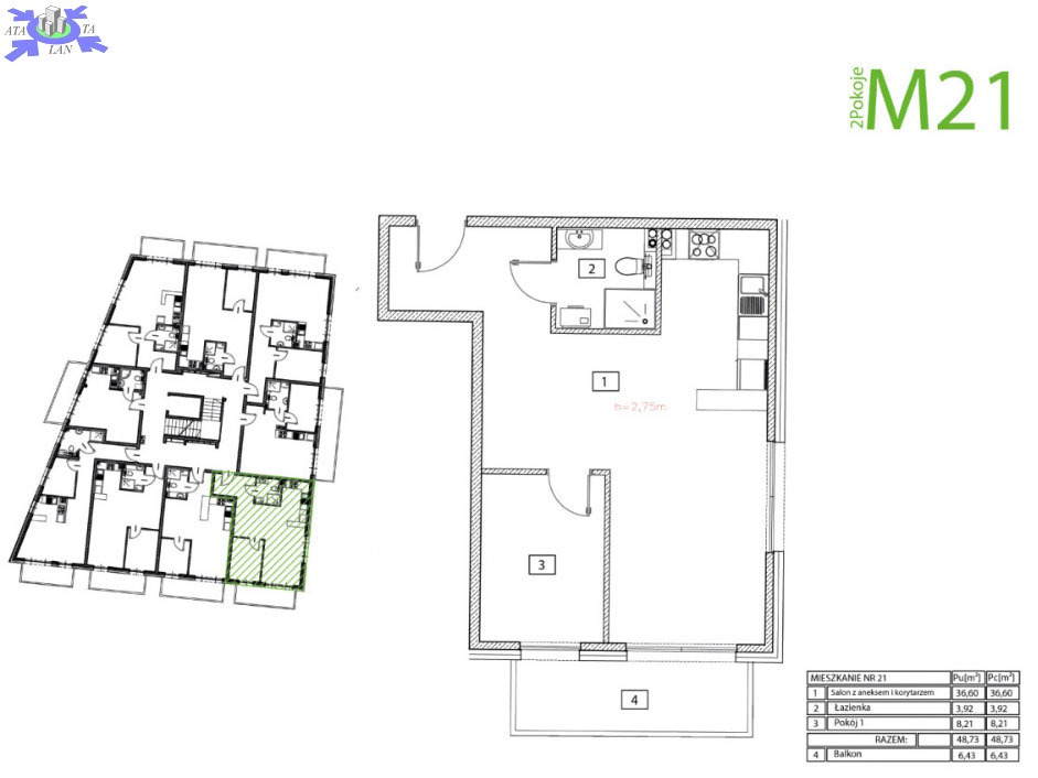 Prezentowany lokal mieszkalny ma powierzchnię 48,73 m2 i składa się z dwóch rozkładowych pokoi w tym jeden w aneksie kuchennym z wyjsciem na obszerny balkon 6,43 m2 (36,60/8,21m2) oraz łazienki 3,92 m2.