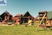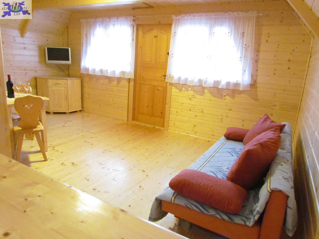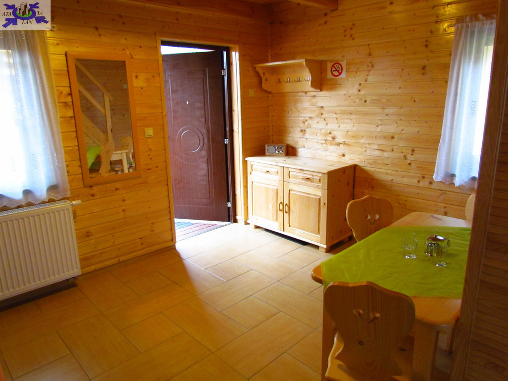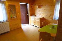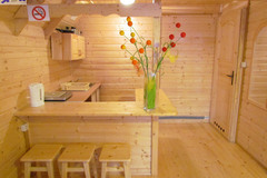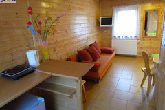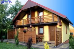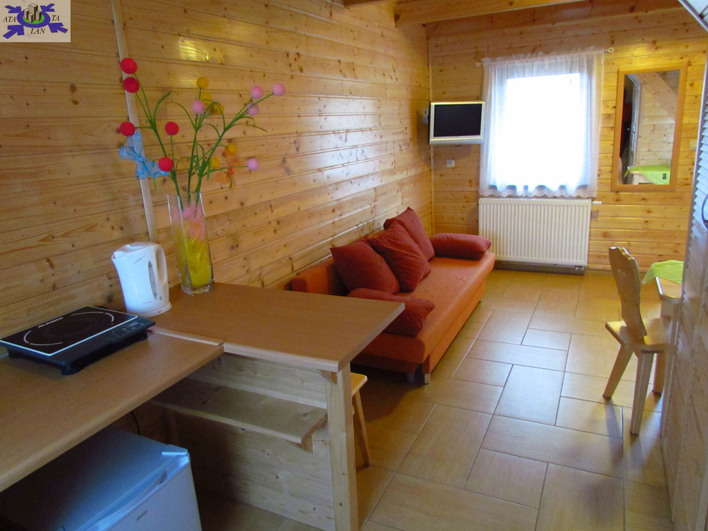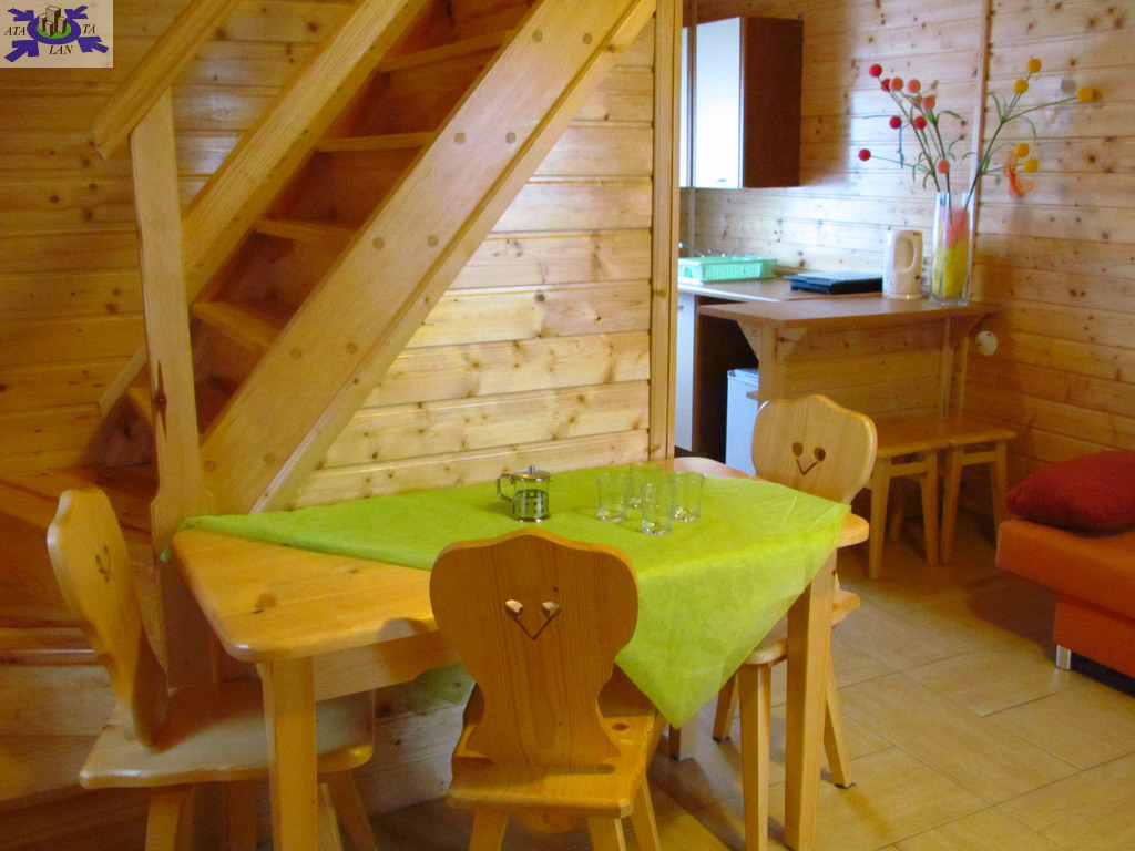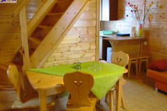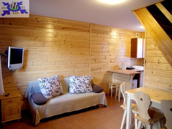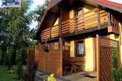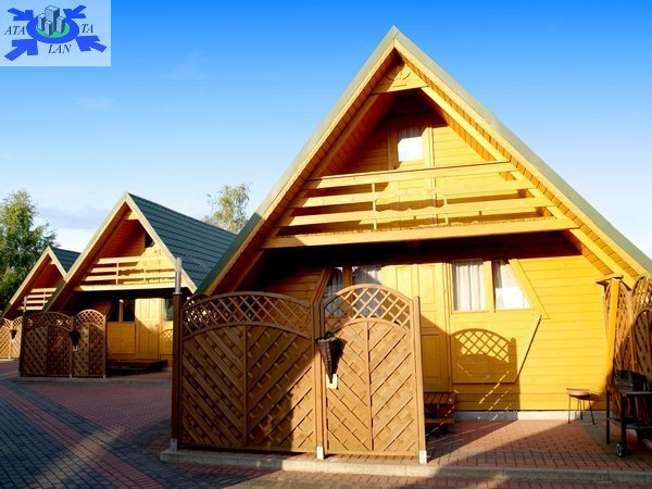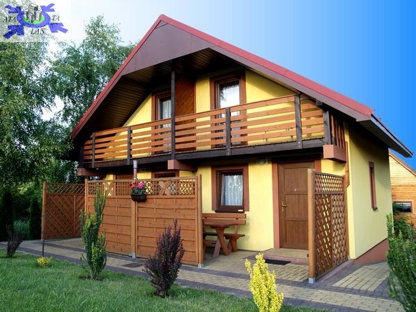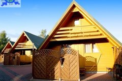 Domki drewniane to 6 osobowe, piętrowe "bliźniaki". Połączone tylnymi ścianami z wejściami po przeciwnych stronach, każda z części posiada balkon. Przed wejściem do każdego domku jest ogródek z meblami ogrodowymi (stół i 2 ławki) ogrodzony pergolami. Domek w całości wykonany jest z drewna.