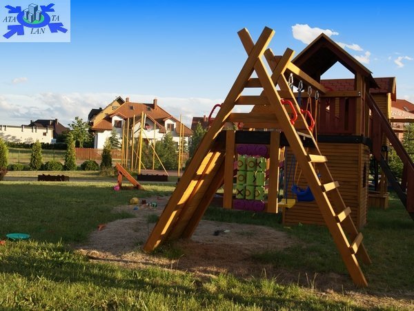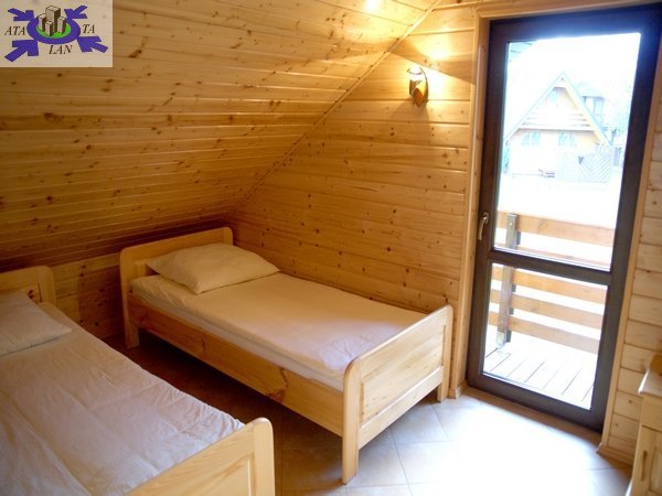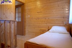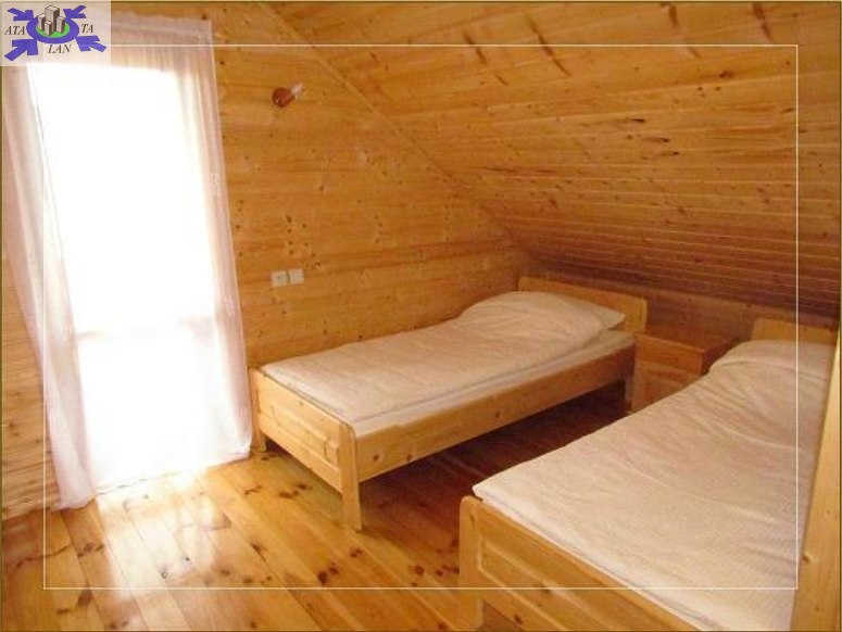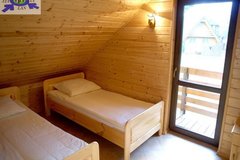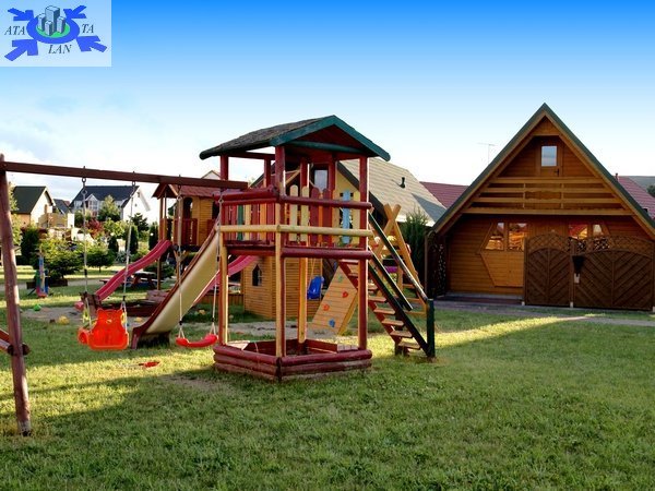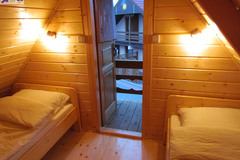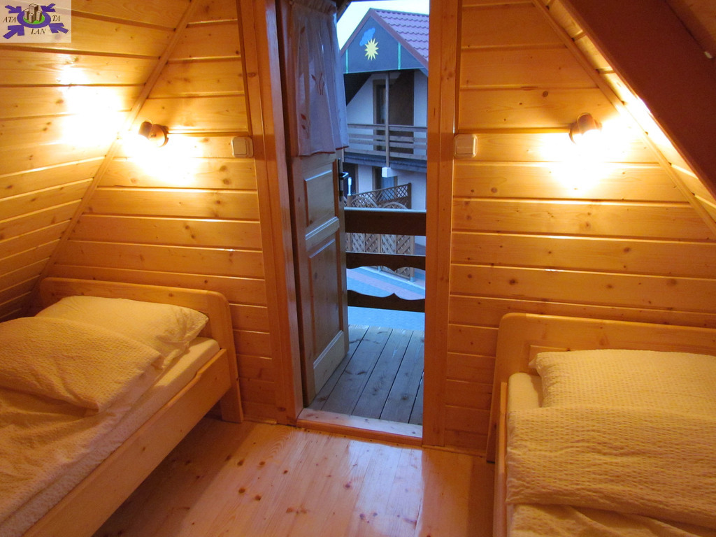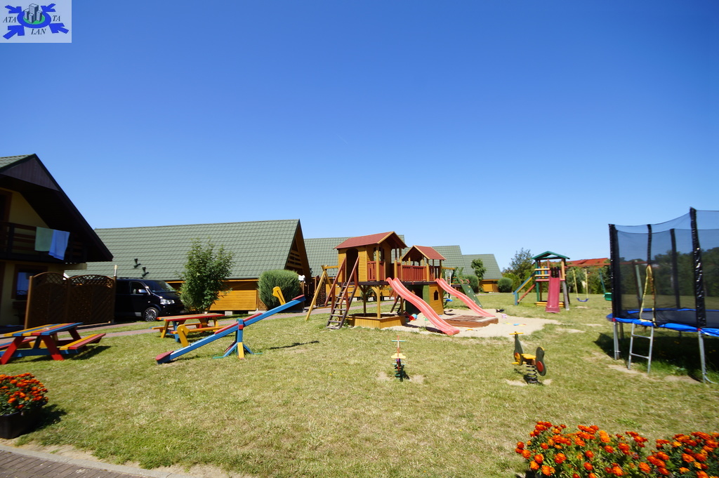 Piętro domku to część sypialna podzielona na dwie części. Jedna z nich jest zamknięta, wyposażona w łóżka drewniane z materacami sprężynowymi. Z tej sypialni jest wyjście na balkon. Druga sypialnia to część otwarta (przy wejściu na schody), w której także znajdują się łóżka drewniane z materacami sprężynowymi oraz szafka nocna. Na terenie obiektu znajdują się także parking, plac zabaw dla dzieci, boisko mały ogródek z miejscem do grillowania na własnym grillu oraz plac zabaw z huśtawkami, drabinkami, trampoliną i piaskownicą. Znajdziemy tam zestaw do gry w koszykówkę, a także innych sportów. Dodatkowo obok boiska znajduje się stół do gry w ping-ponga