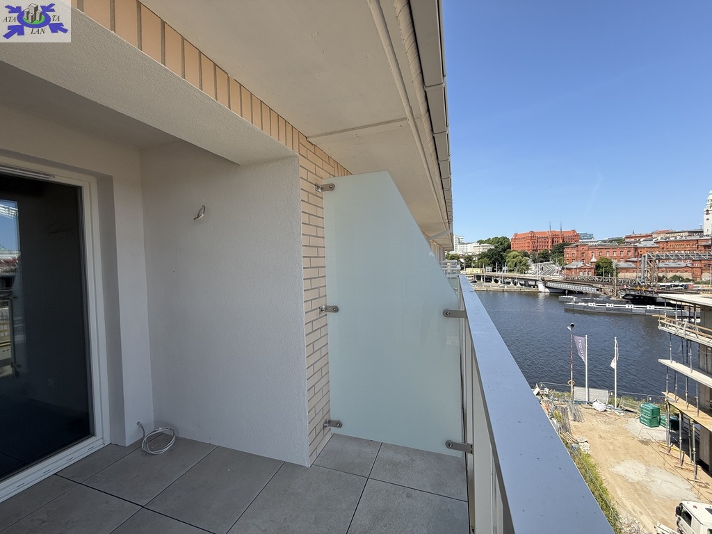 usytuowany na 5. piętrze nowoczesnego apartamentowca przy ulicy Heyki w Szczecinie, stanowiący część inwestycji Nowa Przystań nad Odrą.