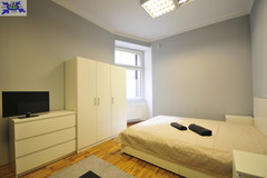 - Drugi pokój o pow. ok. 20 m2, uposażony szerokie łóżko, materac, sofa, komoda, szafa, telewizor, szafkę nocną, ściany gładzone pomalowane, na podłodze panele.