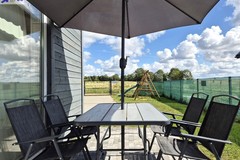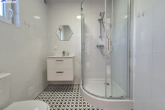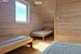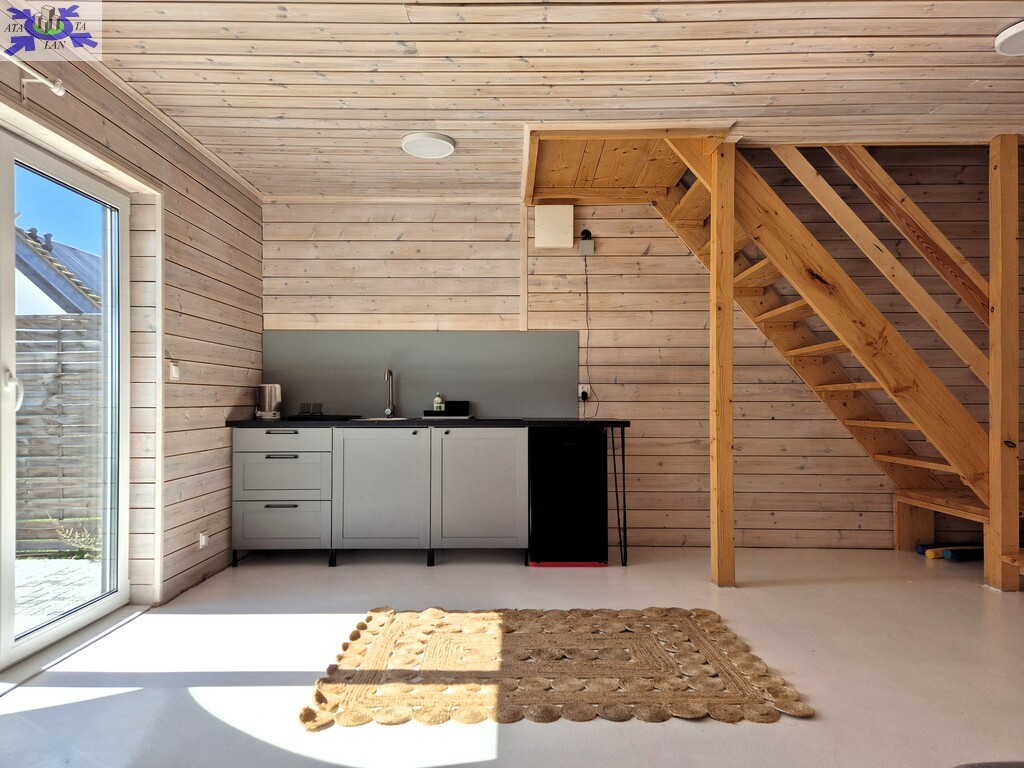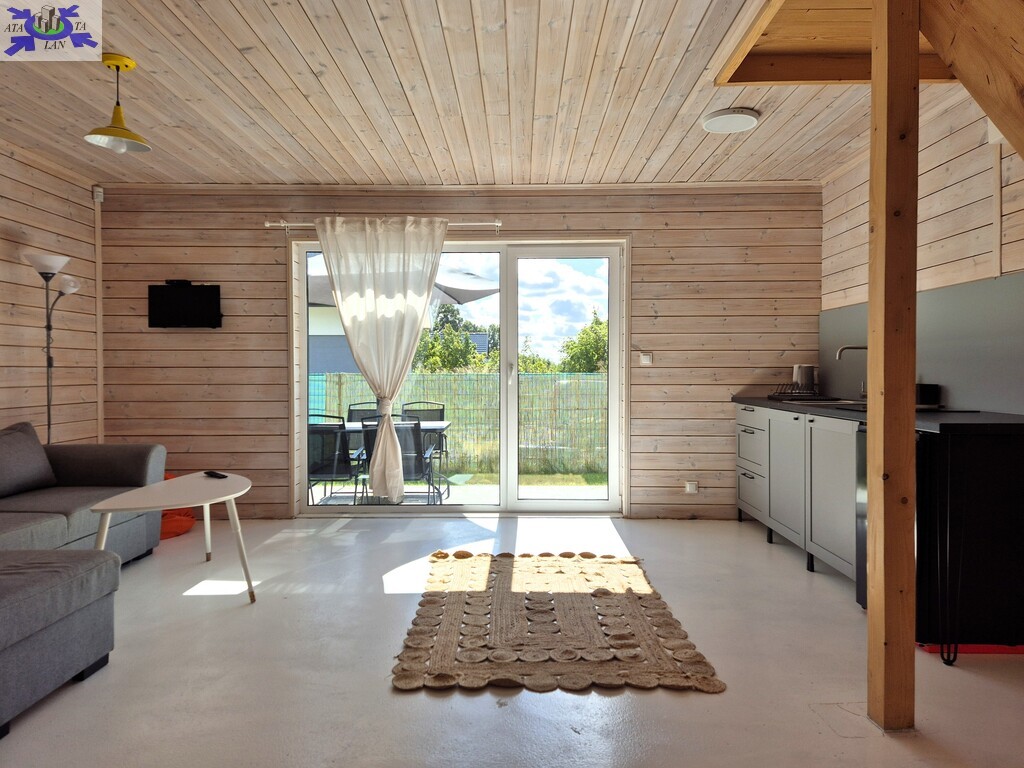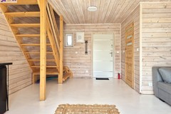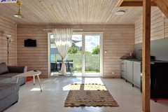 Każdy z trzech domków ma 58mkw (35mkw na dole i 23mkw na piętrze) i może gościć od 5 do 7 osób (1 łóżko podwójne, 3 łóżka pojedyncze, 1 sofa dwuosobowa w salonie). W łazienkach znajdują się kabiny prysznicowe, umywalki i wc, zaś w kuchni funkcjonalny aneks z lodówką, płytą indukcyjną i zlewozmywakiem.