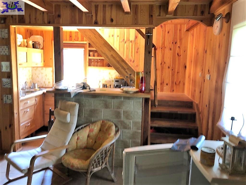 W skład domku wchodzą Salon z wyjściem na przestronny, zadaszony taras oraz wejściem na poddasze użytkowe