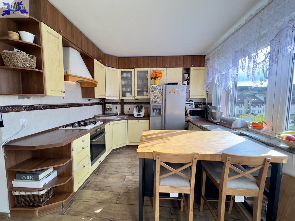 * oddzielna kuchnia z miejscem na duży stół jadalniany, wyposażona w zabudowę kuchenną, lodówkę, zmywarkę, płytę gazową, okap i mikrofalówkę,