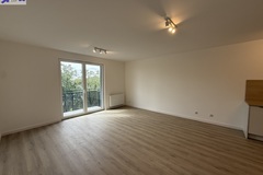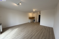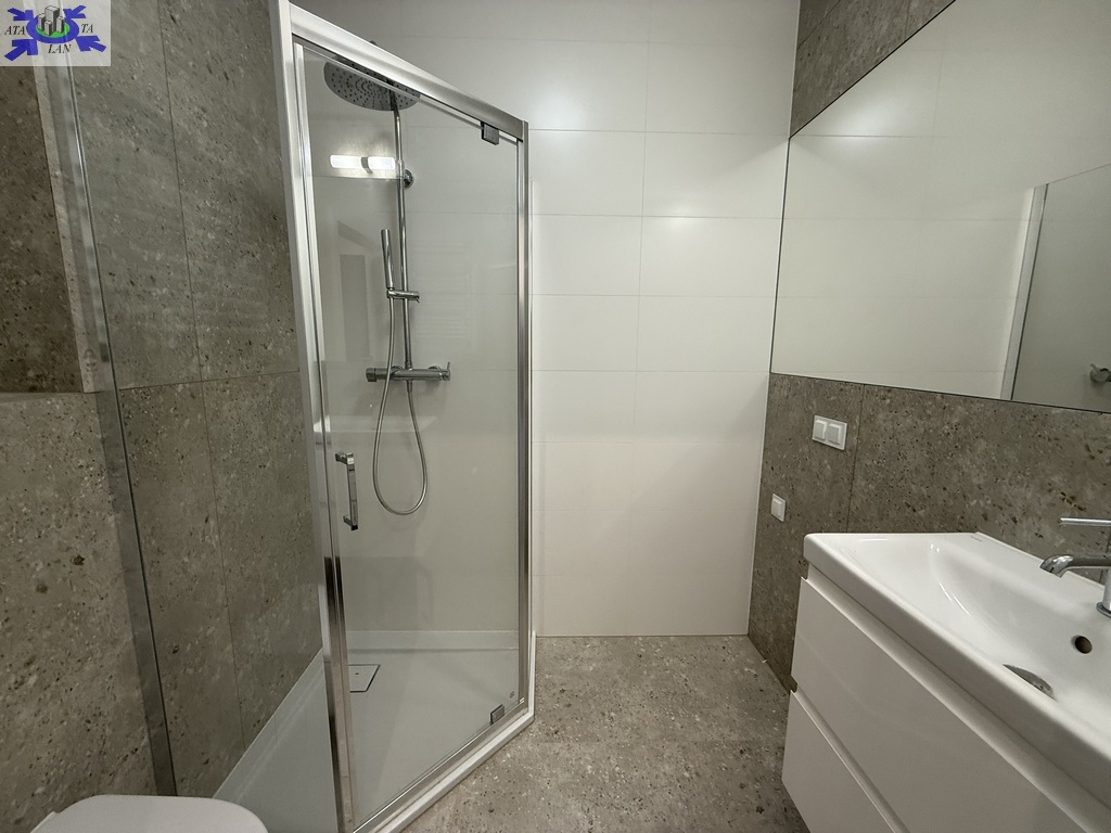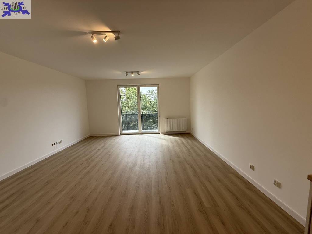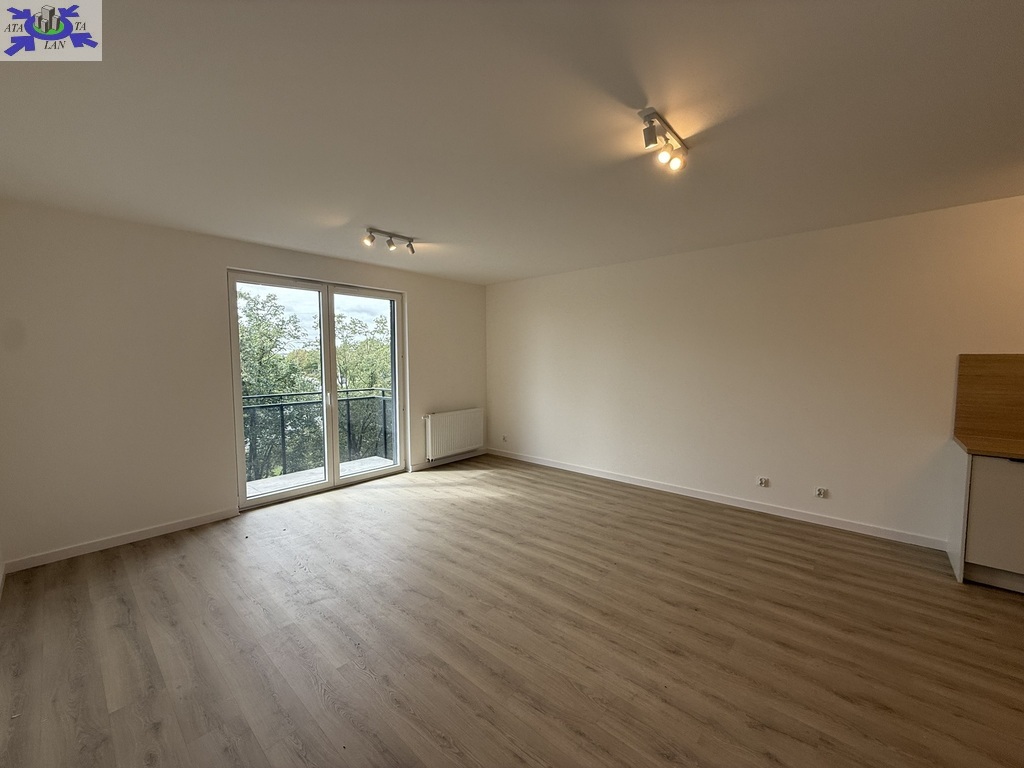 Układ przestronny salon z aneksem kuchennym, łazienka z prysznicem, balkon z widokiem na zieleń