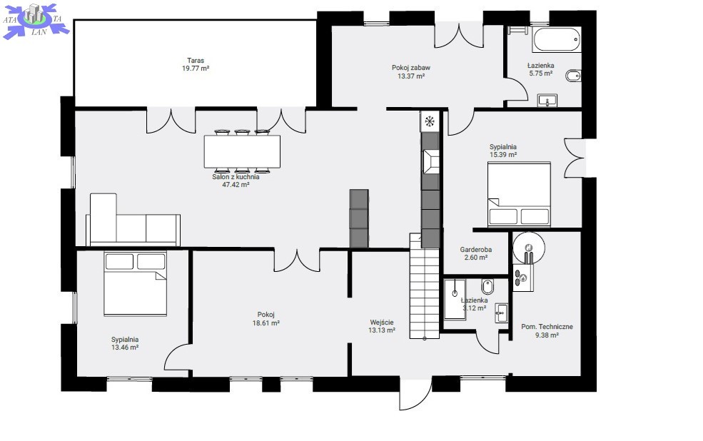 * Salon z aneksem kuchennym z wyjściem na taras (19,77 m2) - 47,42 m2