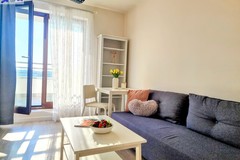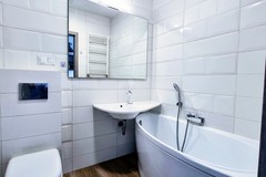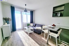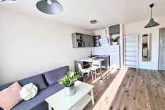 Kuchnia wyposażona w meble w zabudowie oraz sprzęt AGD lodówka z zamrażalką, płyta grzewcza, okap, zmywarka, mikrofalówka. W łazience narożna wanna, umywalka, toaleta, pralka. W sypialni znajduje się w duże łóżko, komodę oraz szafę w zabudowie. Salon mieści kanapę, stolik kawowy oraz stół z krzesłami. Z salonu również wyjście na balkon. Dodatkowo do dyspozycji są dwie szafy - jedna przy salonie, druga we wspólnym przedpokoju.