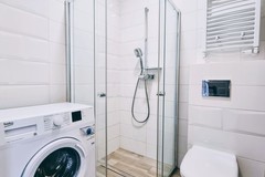Kuchnia wyposażona w meble w zabudowie oraz sprzęt AGD lodówka, płyta grzewcza, okap, zmywarka, mikrofalówka. W łazience kabina prysznicowa, umywalka, toaleta, pralka. W pierwszym pokoju znajduje się w duże łóżko, szafa oraz stolik, w drugim pokoju rozkładana kanapa, stolik kawowy, komoda oraz regał i biurko. Z obu pokoi wyjście na duży taras, idealny do relaksu.