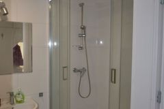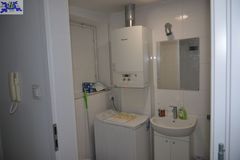 Łazienka z WC o powierzchni ok. 3 m2 została wykończona glazurą i terakotą. Znajduje się w niej kabina prysznicowa, piec dwuobiegowy marki Junkers oraz umywalka.