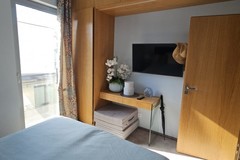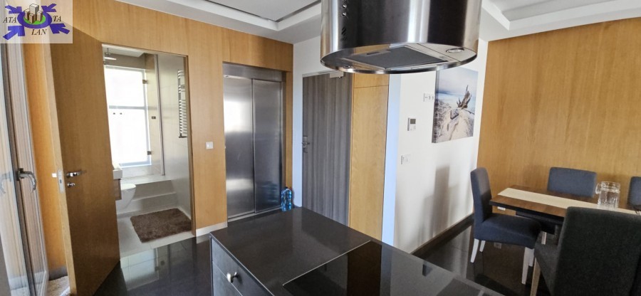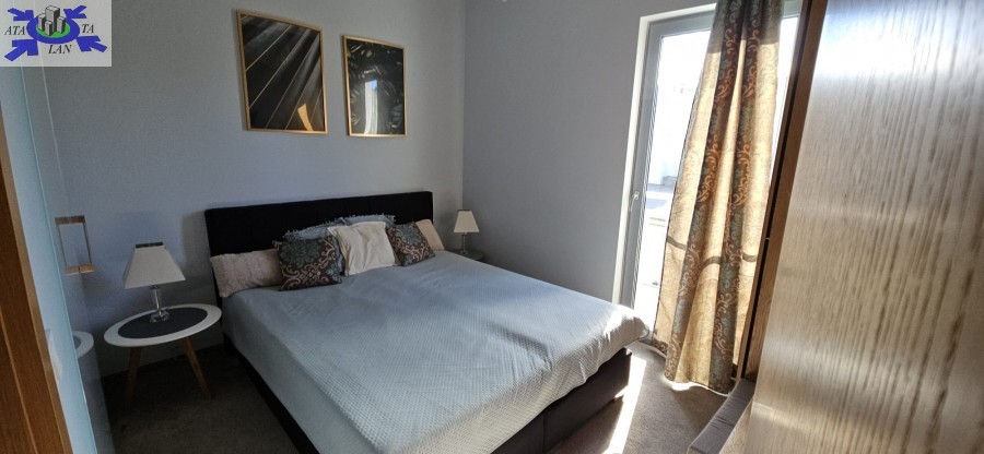 Przestronny salon z aneksem kuchennym łączy funkcjonalność z elegancją, a duże przeszklenia zapewniają doskonałe doświetlenie wnętrza. Dwie sypialnie i dwie stylowe łazienki sprawiają, że apartament jest idealny zarówno do prywatnego użytku, jak i do wynajmu premium.
