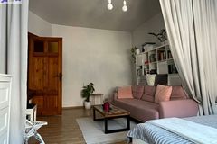 - Pokój dzienny pełniący również funkcję sypialni z wydzieloną przestrzenią na duże łóżko